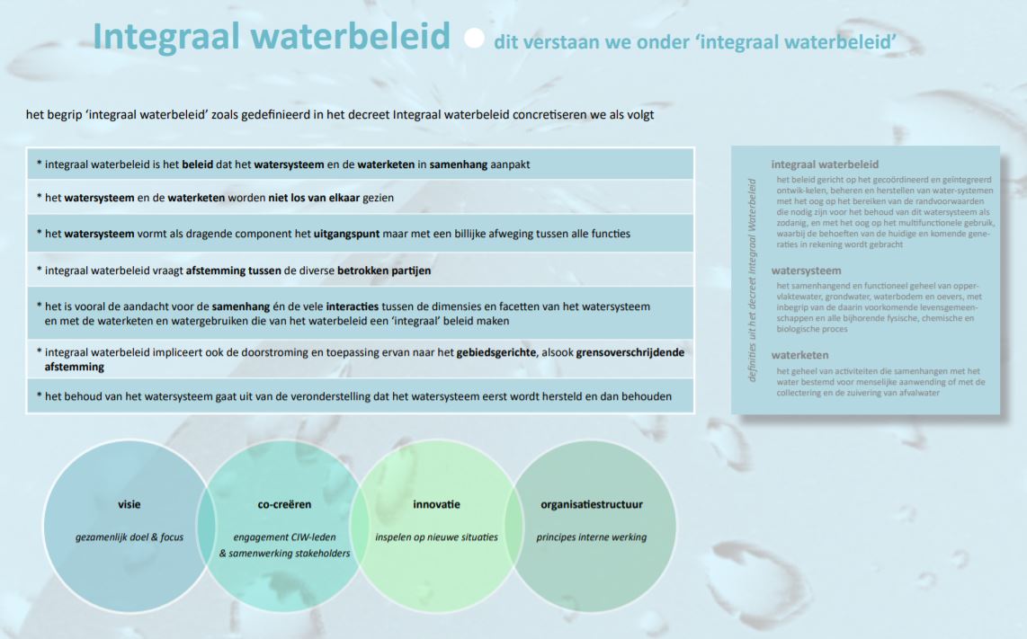De CIW stelt innovatie centraal en speelt in op nieuwe en actuele uitdagingen zoals klimaatverandering, maatschappelijke en technologische ontwikkelingen, … en neemt een regisseursrol op in de transitie naar klimaatrobuuste en veerkrachtige watersystemen en naar een circulaire economie op het vlak van water.